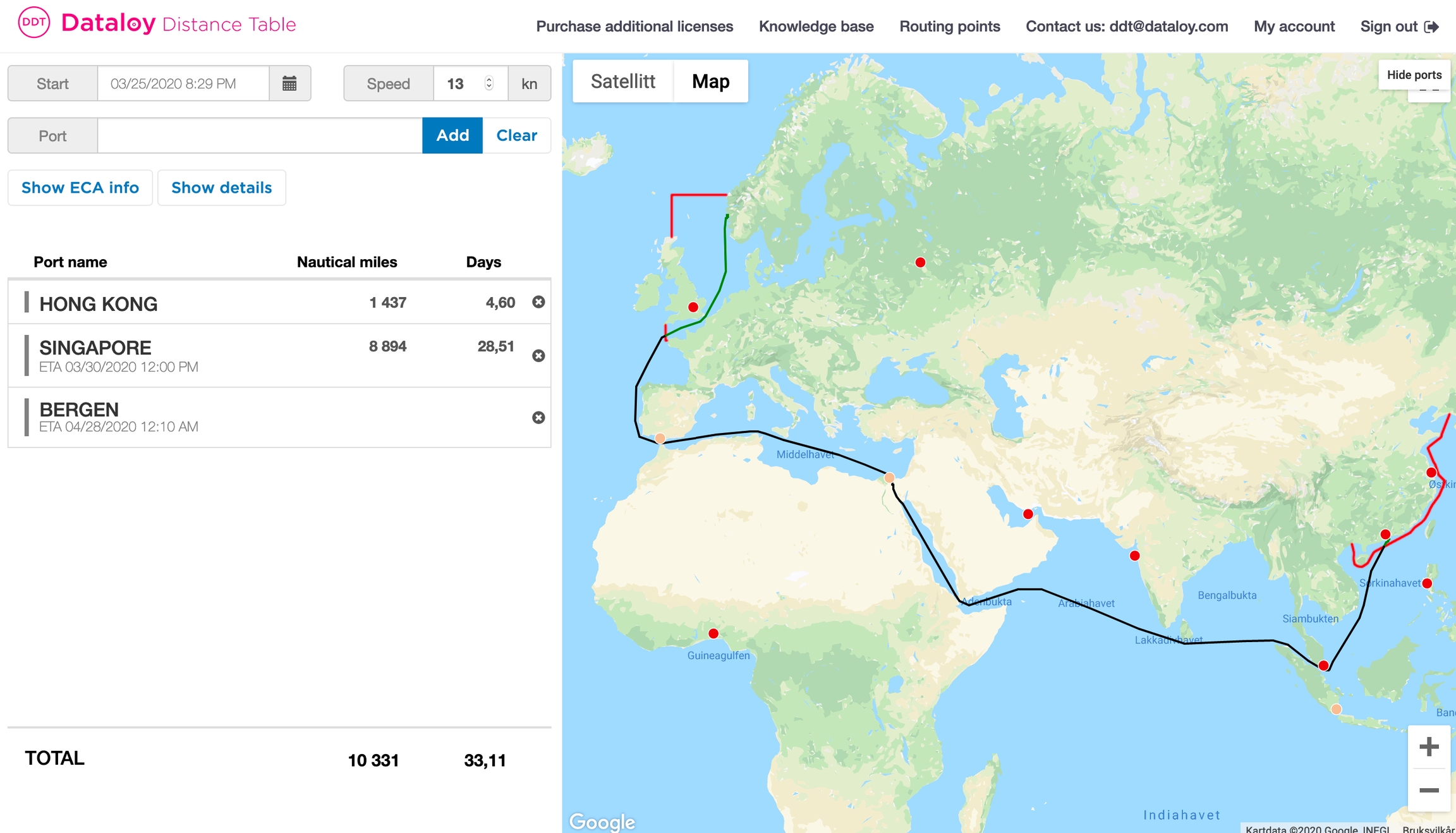 Dataloy Distances allows port and routing point searches when building sailing routes and is available to commercial and non-commercial users. Sailing routes are presented graphically on a map and are based on an analysis of possible routing options.