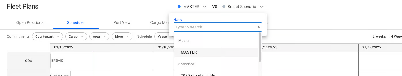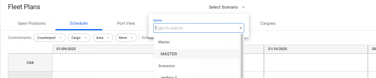To select a different scenario than MASTER, scroll down in the above list to find all scenarios, except [Budgets scenarios](https://app.gitbook.com/o/-LhoT2vqihl0pYiCeolt/s/Zao7rN3mdCfNKVRfQpS0/fleet-allocation-and-scheduling/getting-started/planning/budgets). The MASTER scenario is pinned to the top of the selector for easy accessibility.