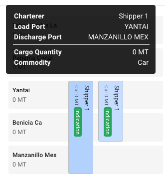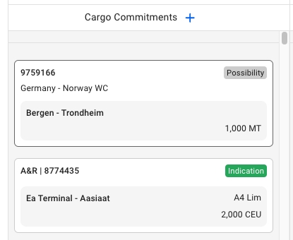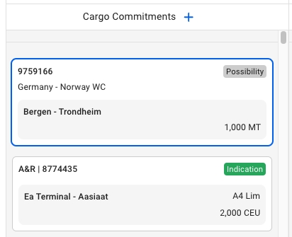 icon. Here, you can find all the different types of cargoes to create, and their modals. Follow the same steps as here to create a new cargo. The new cargo will be placed in this Cargo Commitments column based on the given Laydays. If not given, then they will be placed at the bottom of the list.