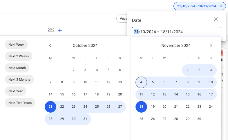 In FAS the date filter will filter voyages and cargoes in all of the boards more efficiently. There are filtering shortcuts for Next Week, Next 2 Weeks, Next Month, Next 3 Months, Next Year and Next Two Years (meaning the past 2 weeks plus selected). The default is set at 'Next 3 Months'. It is also possible to manually select the date range.