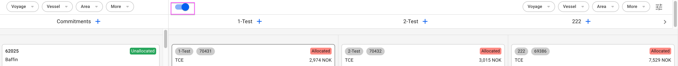 By turning the toggle off, you will be able to hide the Voyage Commitments, or Cargo Commitments, making the allocated sections for voyages and cargoes the full view.