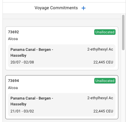 When selecting one of the allocated voyages here too, the same type of blue border will display: along with opening the Voyage drawer as well: