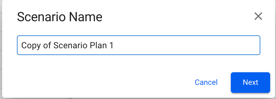 By default, the "Copy of original scenario name" will be added at the input, until you decide for another name. Each of the scenario names should be unique to avoid duplicates in the system (there is a validation check for this when typing). Moreover, you can step through the modal to specify further: