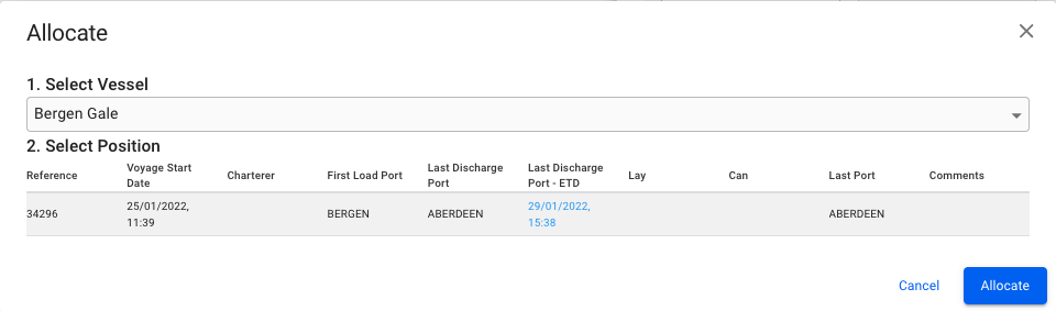 When changing status from estimate to Allocate, the following modal will show, where you have to select the vessel, and if you want, you can manually change the position. It will by default be put last.