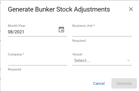 When clicking the Generate button in the top left corner, a modal will appear where you can select month/year, business unit, company and vessel to generate bunker stock adjustments.
