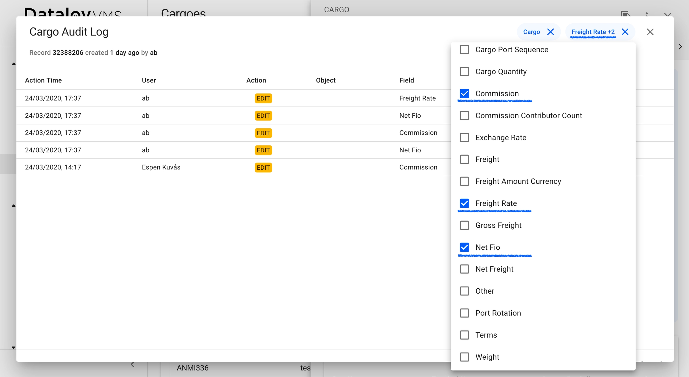 Once in the Audit Log modal you will see the changes of the item that was opened in the drawer sorted by date with latest changes on top.