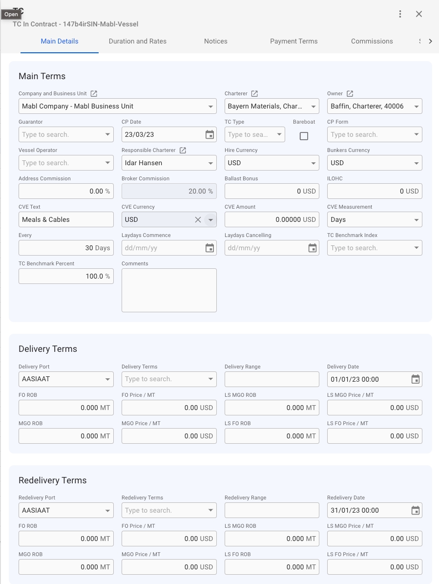 The Main Details tab that is shown by default when opening a Time Charter Contract has 3 sections where you can edit information on the Time Charter Contract.