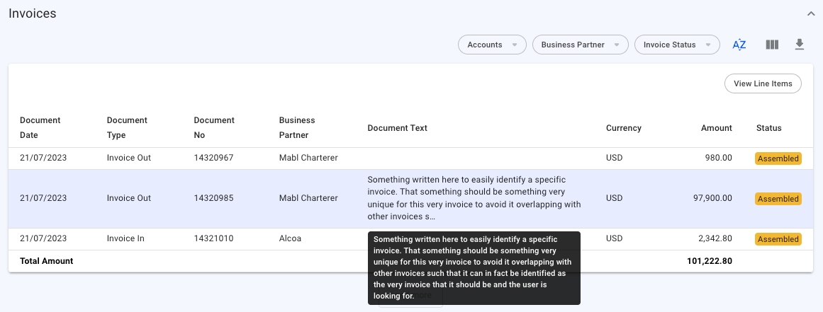 In addition to separate columns, this document line list also has adjustments to its filters at the top of the section as well. The document line list has filters for Account, Port, Business Partner(Invoice Party) and Booking Number as shown in the picture above.