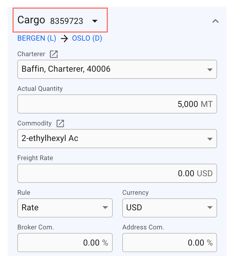 The Cargo section lets you make changes to the most important data on your cargo. Use the **Cargo** selector button to switch between multiple cargos.
