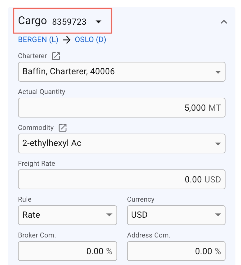 Changing vessel in this section will change the voyage's and the connected cargoes' company and business unit to the selected vessel's.