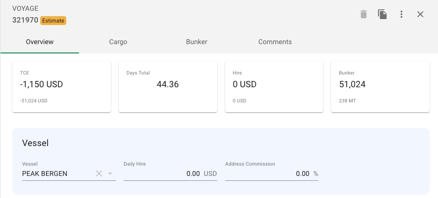 In order to get a complete voyage result estimation, it is possible to edit the daily hire and address commission for vessels/voyages that does not have TC-in present in the system.