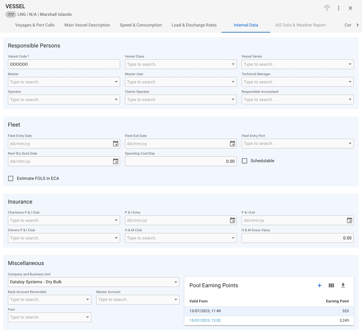 Vessel "Internal Data" can be accessed in the top tab menu.
