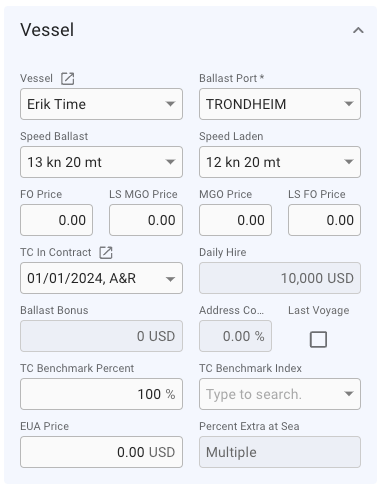 Changing vessel in this section will change the voyage's and the connected cargoes' company and business unit to the selected vessel's.