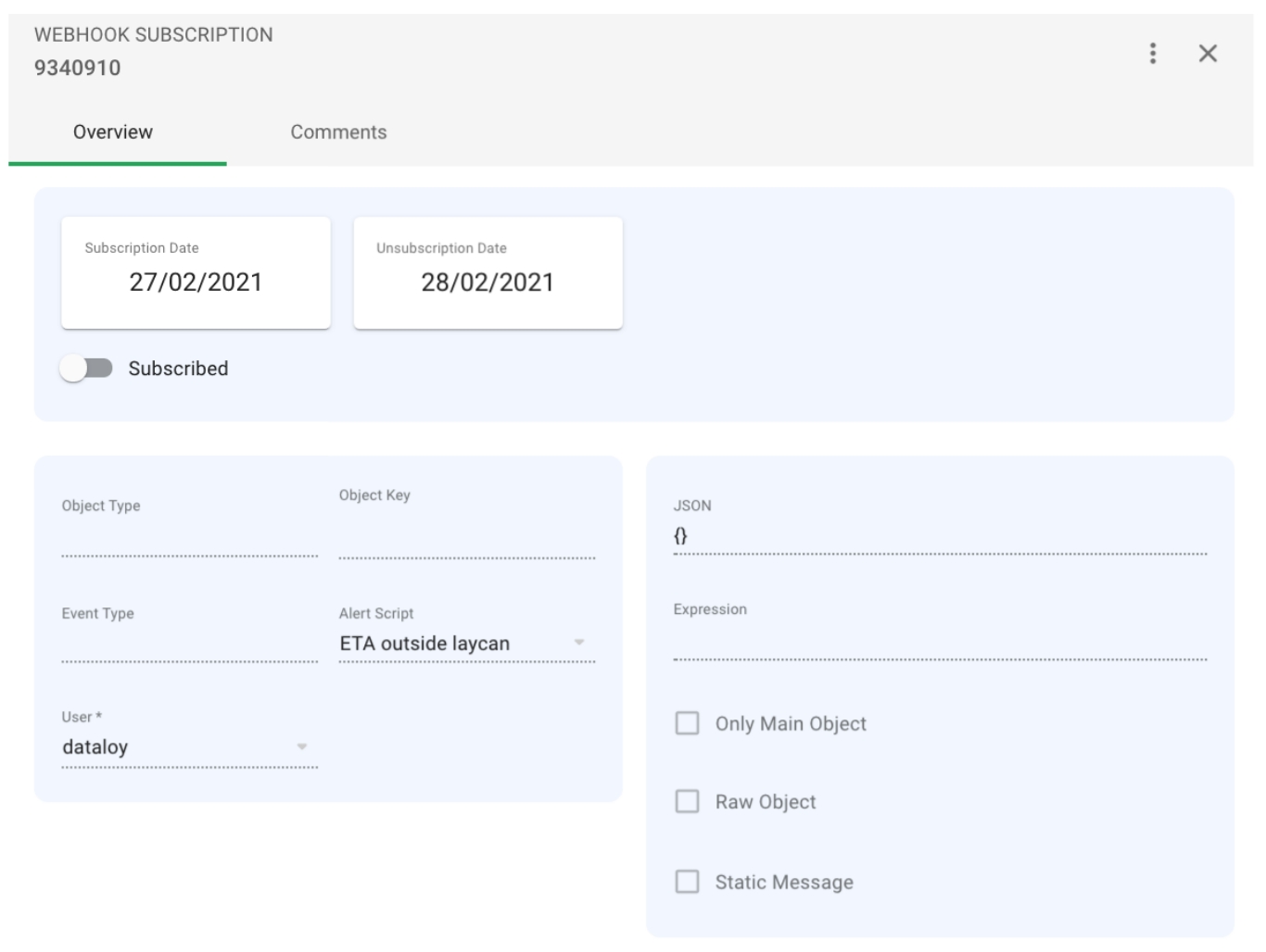 In the Overview tab you can view details, as well as subscribe or unsubscribe to the selected webhook subscription.