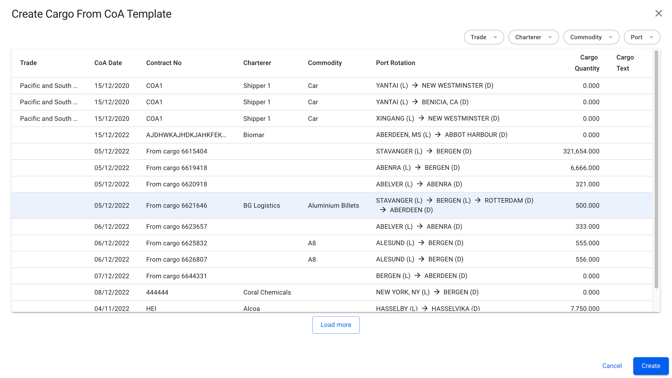 To efficiently create a cargo, and link them with CoAs, you can create a cargo based on a CoA Template. The CoA Templates are the template cargoes that are maintained in the CoA module.