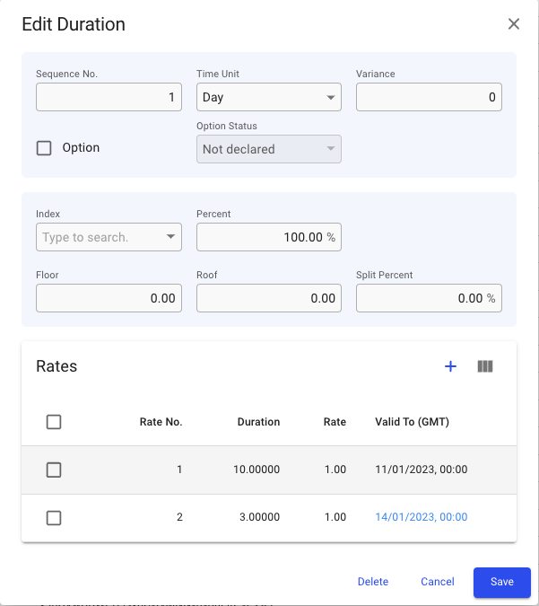 When creating a **Duration** you can enter **Duration** information in the fields and at the bottom you can see the current **Rates** on the **Duration.**&#x20;