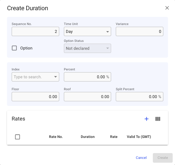If you want to add **Rates** to the **Duration** you can click the ![](https://content.gitbook.com/content/RMtOrONq9bo4Fhz06Jsg/blobs/Yy1nECuIAxCMqvcah1vh/image.png)-icon in the upper right of the **Rates** Section to create a **Rate** on the **Duration.** This will open up a new **Create Rate** modal.