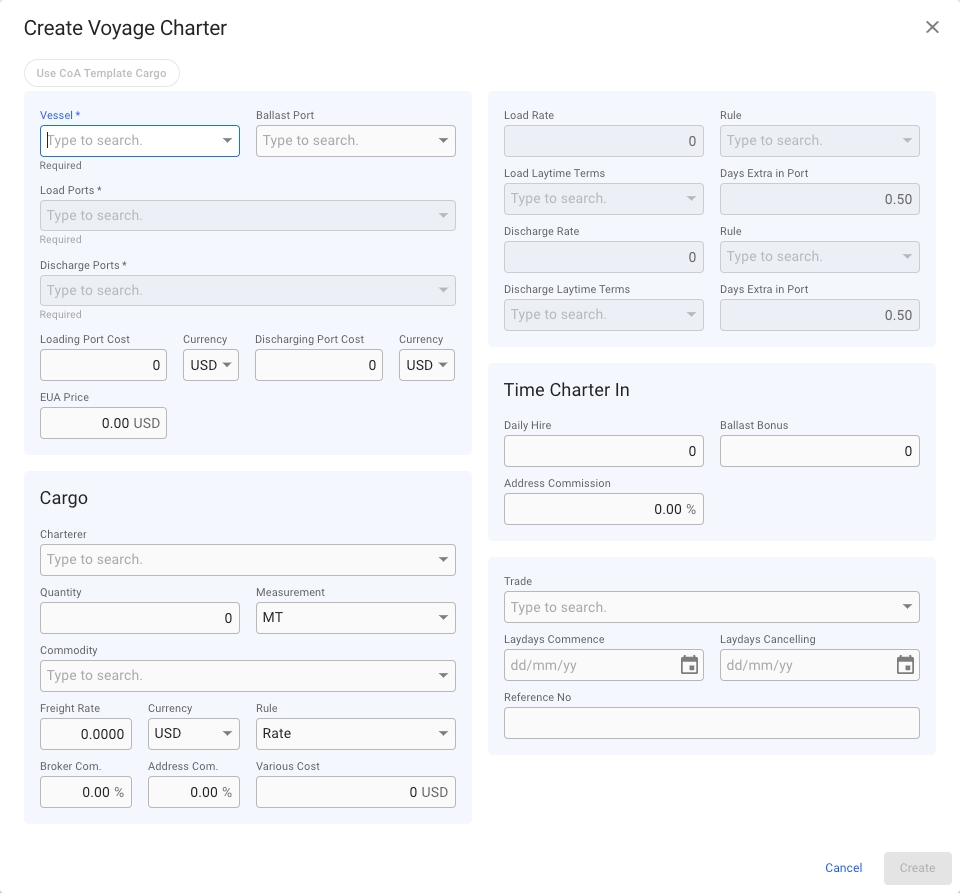 b. you can choose a vessel, and afterwards click the Use CoA Template Cargo button, which will link to the same modal as described here: Create Cargo From CoA Template. Using a CoA Template will give the voyage and the cargo the same Company and Business Unit as the CoA.