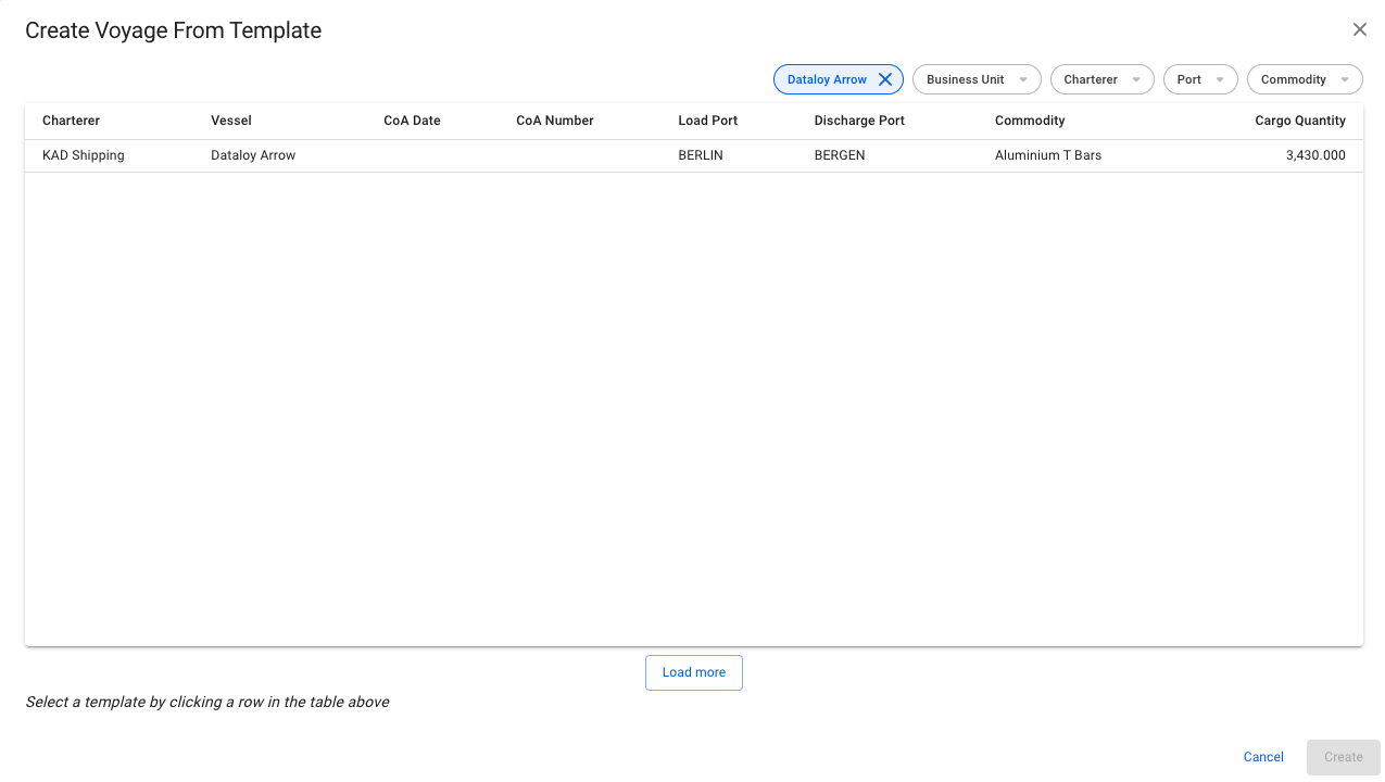 4. In the modal, **select** a CoA template voyage to create the new voyage. The fields that are pre-filled are the ones that were filled in when creating the CoA template itself, which the new voyage will inherit, as well as Company and Business Unit.