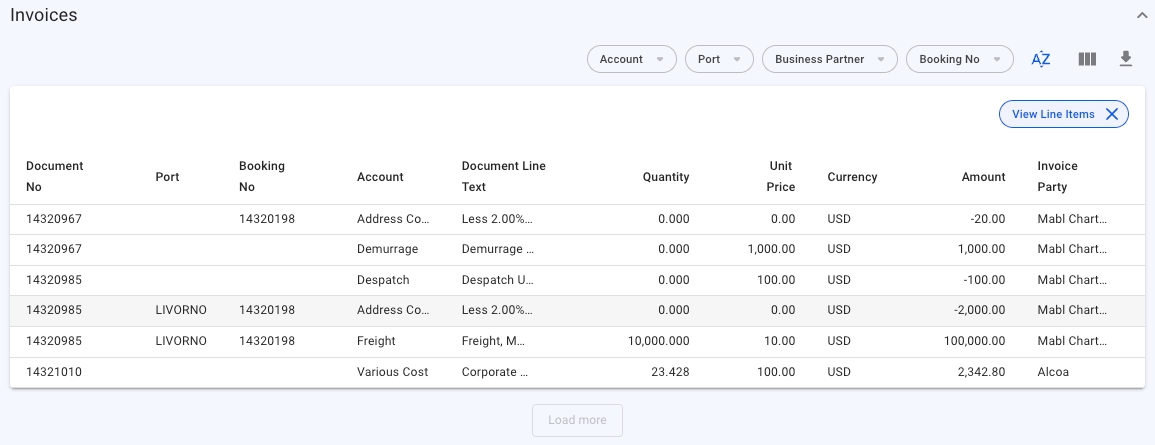 In addition to separate columns, this document line list also has adjustments to its filters at the top of the section as well. The document line list has filters for Account, Port, Business Partner(Invoice Party) and Booking Number as shown in the picture above.