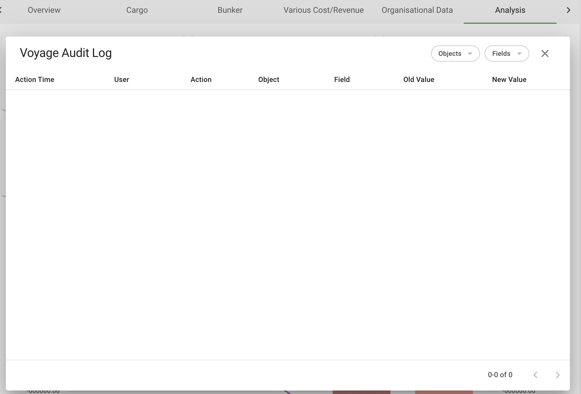When you are in the analysis tab and you select a snapshot from the analysis chart the See Audit Log will be activated, and you may click this button to see the audit logs from the previous snapshot to the selected snapshot. This button is not activated for the first (Preliminary snapshot) as this has no previous snapshot to compare with.