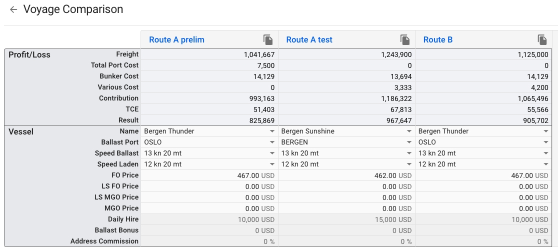 In this early implementation, you are able to view and compare the values in the Profit/Loss section, and in the Vessel section also edit the fields, between the voyages. The voyage you are comparing to is the left-most voyage. When you use the copy-function to the right of the table header, you copy that specific voyage. Meaning, the values will initially be the same, until you alter the values yourself.