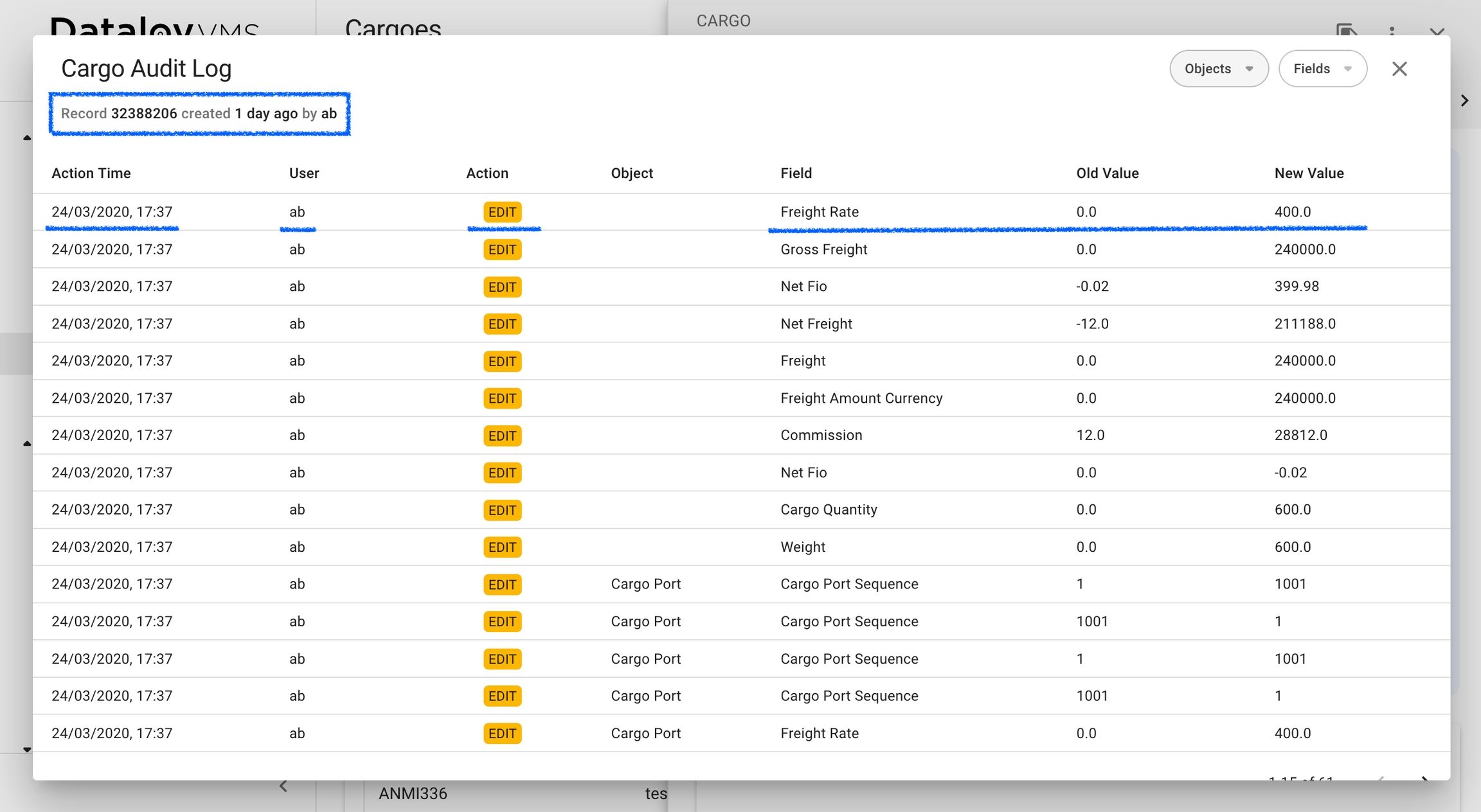 Once in the Audit Log modal you will see the changes of the item that was opened in the drawer sorted by date with latest changes on top.