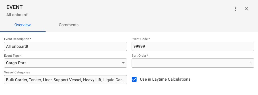 An event can be used in Laytime calculations. If the corresponding checkbox is clicked, the event will show up automatically at the specified position in the Laytime calculation module under a Cargo Port.