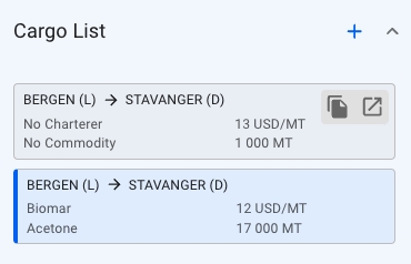 To the left, a list of cargos are presented as small cards, showing you some select details about the cargo. This is meant to be a quick overview, to be able to differentiate between the different cargos. Clicking on a cargo will select it, and the Cargo-section to the right will update. The currently selected cargo is marked by a blue line on the left side of the card. Hovering over a cargo card will bring up the option to copy it, or open the cargo drawer. While a cargo drawer is open, you may click on any part of the card to open the cargo drawer for that cargo.