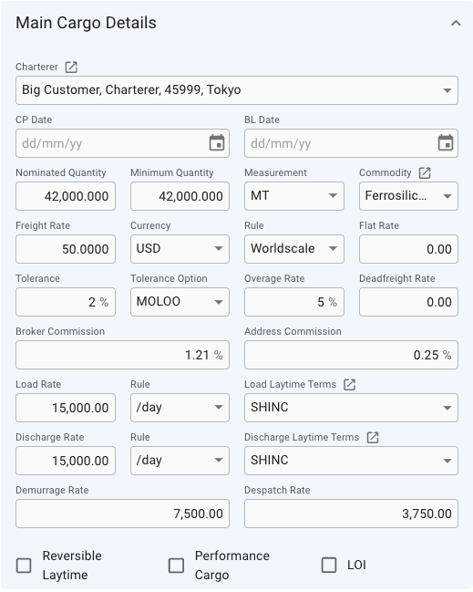On the right side, below the Bunker Adjustment section, you can enter external reference, Trade, Cargo Text, Comment, Company, Business Unit and Cargo Operator: