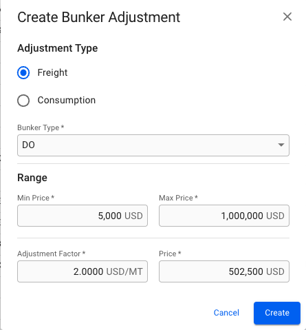 For both of these options you will be able to choose the bunker types: DL (LS MGO), DO (MGO), FL (LS FO) or FO. You can also input/edit the other fields, such as: Min Price, Max Price, Adjustment Factor/Agreed Consumption and Price. The Price field is still editable even though the input of the Min-/Max Price fields calculates the average price.