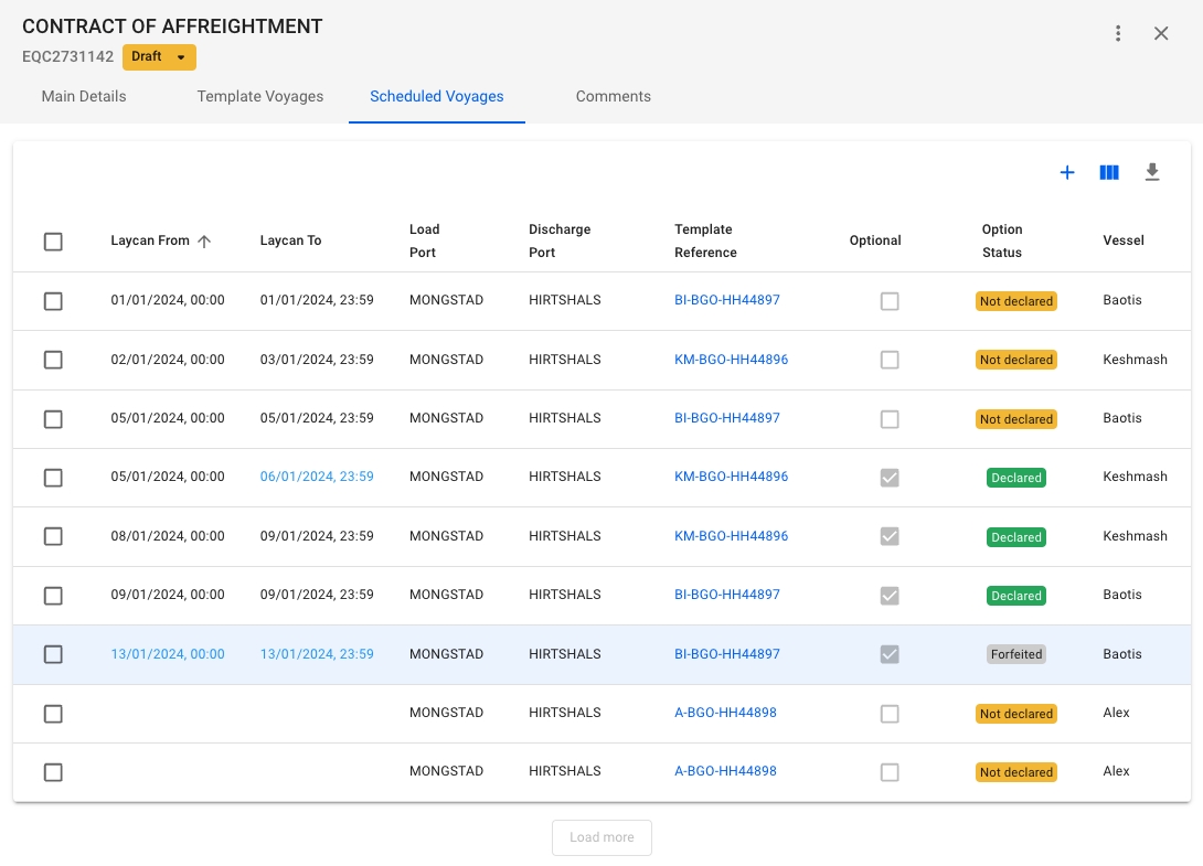 Clicking a voyage row will open up a edit modal that allows you to edit the following fields: Laycan From, Laycan To, Optional, Option Status, Comment
