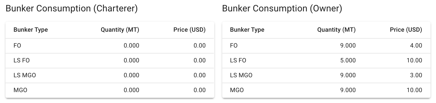 Two tables show information about bunker consumption for the charterer and the owner/opex. Each table contains 4 rows with information about the quantity and bunker price for each bunker type (FO, LS FO, LS MGO, MGO).