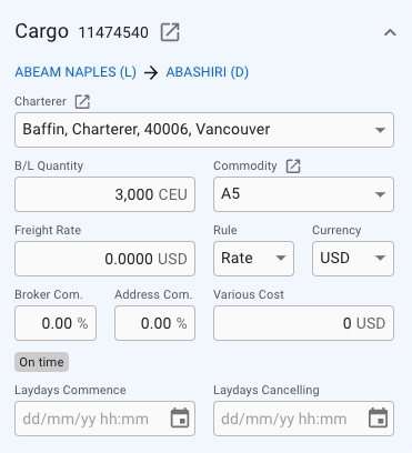 The cargo section allows you to directly change some of the fields of the performance cargo from the voyage drawer without having to open the cargo drawer, if you are looking for more fields however, you will need to open the cargo drawer ( clicking the icon will open the cargo's drawer)