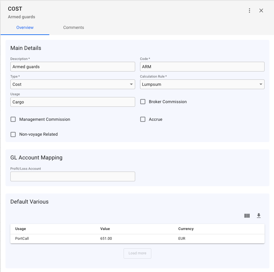 Default various is a various that is always created whenever its usage object is created. The list in the picture above shows that the various "Armed guards" has one default various that is created whenever a port call is created.