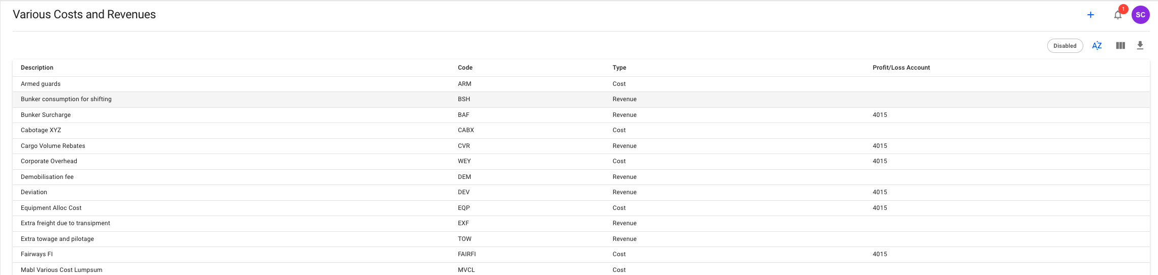 Opening the "Various Cost and Revenues" module under "Master Data" will show a list of all available various cost/revenue.