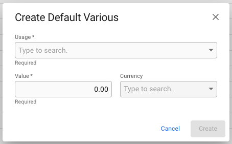 Fill in the values: - Usage: The object that will trigger the creation of the various - Value: The value of the various when created - Currency: The currency of the various value (optional) In addition, when creating a default various with the usage object "Voyage", it is possible to select whether the various should be created for all voyages, only TC voyages, or only voyage charters.