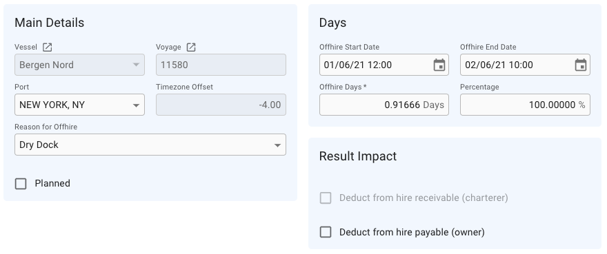The Main Details and Days sections contain fields used to update an offhire. These fields include those used to create an offhire, as well as the following: