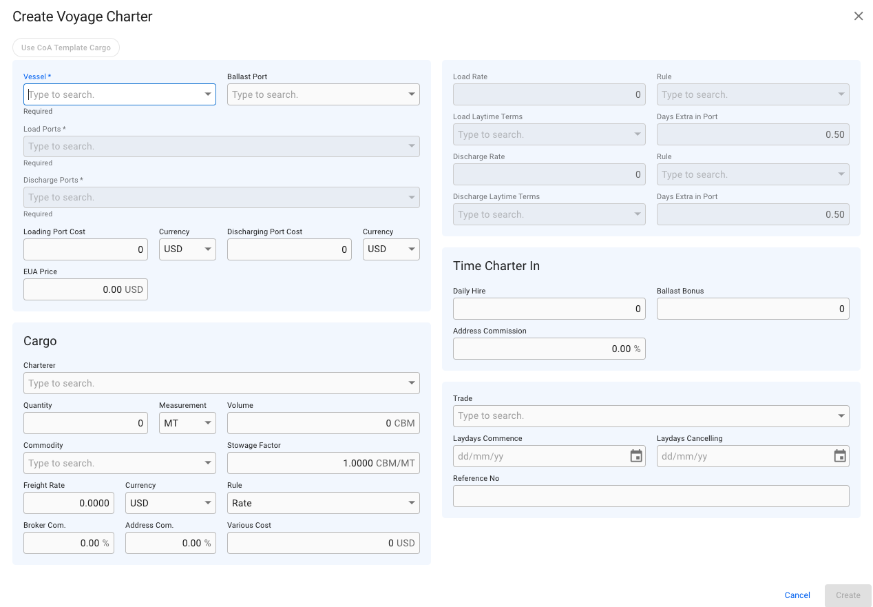 b. you can choose a vessel, and afterwards click the Use CoA Template Cargo button, which will link to the same modal as described here: Create Cargo From CoA Template. Using a CoA Template will give the voyage and the cargo the same Company and Business Unit as the CoA.