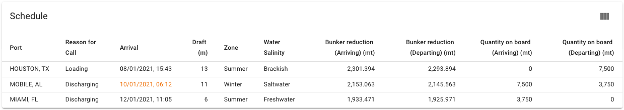 A table of all the port calls on this voyage is shown in this section. To change the intake reduction properties per port call, click a row to open a window where you can make adjustments. Some columns are hidden by default, and can be toggled on/off by using the "Customize Columns"-button in the top right corner of the table.