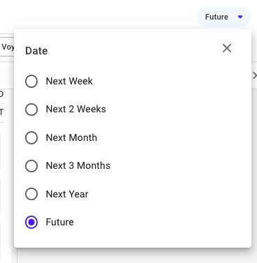 In the FAS board, we now have MASTER date filter, that will filter voyages and cargoes in both all of the boards, more efficiently. We have the filtering possibilities for Next Week, Next 2 Weeks, Next Month, Next 3 Months, Next Year and Future (meaning today and beyond). The default is set at 'Next 3 Months'.