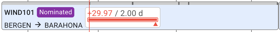 Scheduler bars can be found in the Schedule section and contain information about either allocated or nominated voyages, containing Reference No, Voyage Status, first Load Port and last discharge port. If the Laycan dates have been set, a Laycan indicator can also be viewed on a schedule bar. A timeline of the ballast and port calls can be viewed on top of each bar.