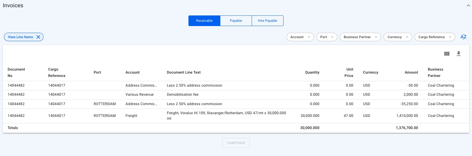 At the top left, above the list, you can click a button that says View Line Items which will swap out the documents in the list with the document lines of the documents on the voyage or TC In. This list has document line-specific columns and filters. Clicking one of the document lines will open its corresponding Document drawer.