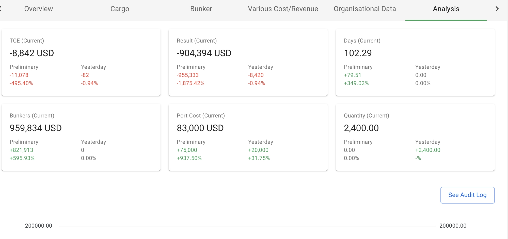When you are in the analysis tab and you select a snapshot from the analysis chart the See Audit Log will be activated, and you may click this button to see the audit logs from the previous snapshot to the selected snapshot. This button is not activated for the first (Preliminary snapshot) as this has no previous snapshot to compare with.