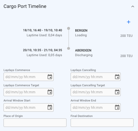 On the right side, below the Cargo Port Timeline section, you can create/edit and view a list of Bunker Adjustments on the cargo: