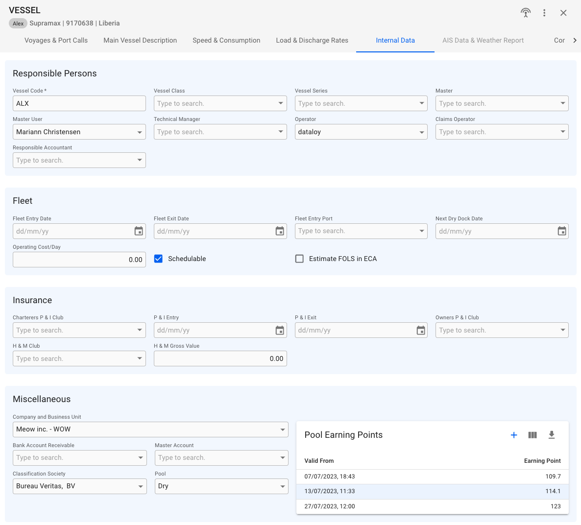 Vessel "Internal Data" can be accessed in the top tab menu.