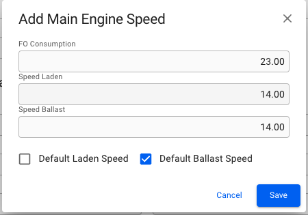 In the Main Engine table, click Add Main Engine Speed<img src="https://content.gitbook.com/content/qR2su6G6yZkQP0s1K3PM/blobs/wlHvVFkZfI4xr13t2xOq/create-24px.svg" alt="" data-size="line"> and fill in the fields.