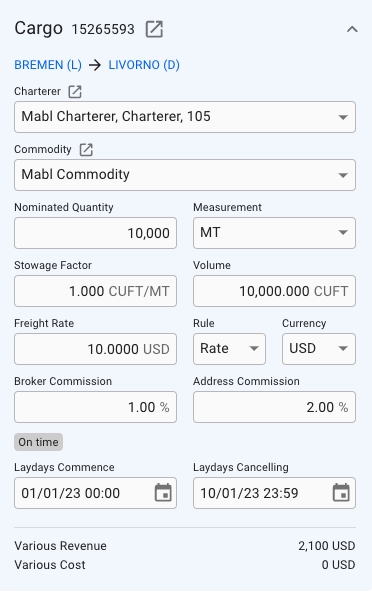 The Various Revenue- and Cost fields are not editable from this section anymore, but you can view the values from the bottom of this section (as seen above). These values comes from the performance cargo of the voyage.