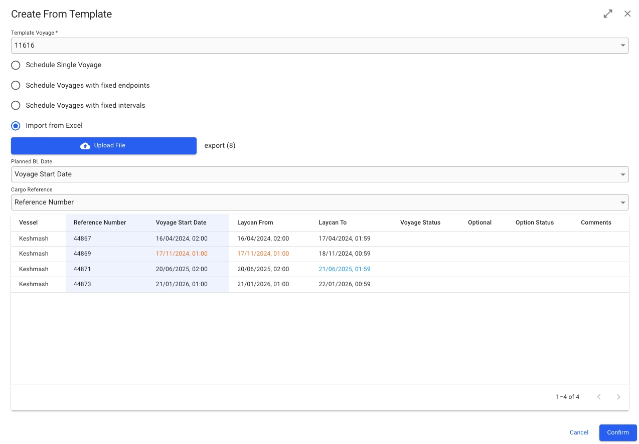 In the Import from Excel option, an external file (xlsx or csv) must be uploaded where you have to define which field to populate "Planned BL Date" and "Cargo Reference". The amount of rows in the file/table defines the amount of voyages that will be generated.