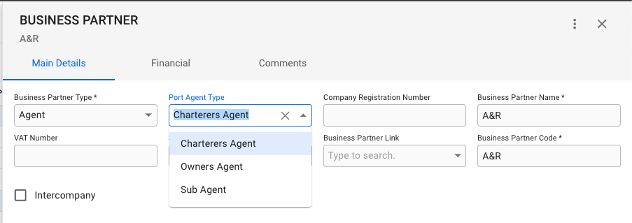 The field labeled "business partner type" determines the preferred role of the business partner. This selection influences in which business partner selectors the partner will appear in the system. For instance, selecting "charterer" as the type will display the partner in "charterer" fields only, but not "agent" fields. However, by clicking "see all options", all business partners can still be chosen in any selector.